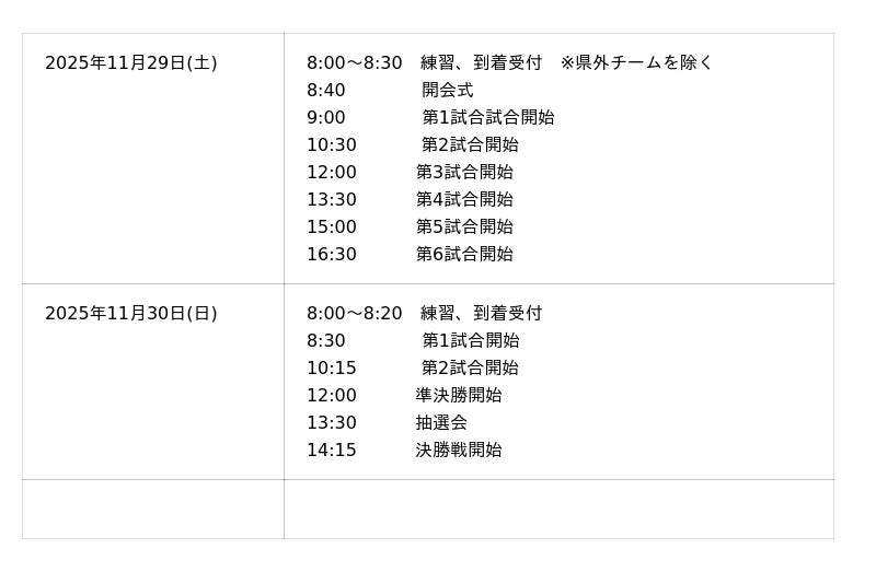 なお、出場チーム数確定後にタイムスケジュールを確定いたしますので、こちらの内容から変更する可能性がございます。