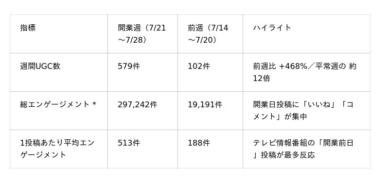 本レポートは 2025年1月1日~7月31日 の 29週・2,227投稿・約56万エンゲージメント を集計し、開業週(7/21週)の急増トレンドに加え、半年前からの “期待感” が数値で確認できた点を示しています。