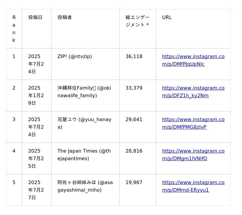 ZIP! や Japan Times はフォロワー母数の大きさを背景に大量の「いいね」を獲得した一方、コメント率は 0.3-0.4 % 前後と低め。 対照的に 花屋ユウ(0.91 %)と 沖縄移住Family(0.73 %)はコメント比率が高く、旅行計画や体験談への質問が活発。対話型のエンゲージメント を生み出している。