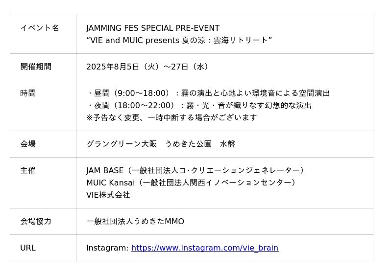 次世代型ウェアラブル脳波計の開発とニューロテクノロジーの社会実装を行うVIE株式会社(本社:神奈川県鎌倉市、代表取締役:今村 泰彦、以下「VIE」)は、JAM BASE(運営組織:一般社団法人コ・クリエーションジェネレーター)、MUIC Kansai(運営組織:一般社団法人関西イノベーションセンター)と共に、グラングリーン大阪にて、「JAMMING FES SPECIAL PRE-EVENT “VIE and MUIC presents 夏の涼:雲海リトリート”」を、2025年8月5日(火)~27日(水)の期間限定で開催いたします。
