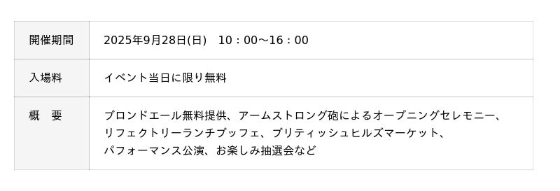 神田外語グループが運営する宿泊施設兼国際研修センターのブリティッシュヒルズ(福島県天栄村)は、2025年9月28日(日)に、「天栄村・ブリティッシュヒルズふれあいイベント」を開催いたします。本イベントでは、ブリティッシュヒルズオリジナルビア「ブロンドエール」の無料提供のほか、メインダイニングでのランチブッフェ、天栄村特産品やハンドメイド作品が並ぶマーケットの開催や抽選会、地域団体によるパフォーマンスなどを通して、天栄村の魅力と英国文化をお楽しみいただけます。さらに、日ごろからご愛好くださる皆様への感謝の気持ちを込めて、この日に限り入場料無料でご案内いたします。ぜひご家族・ご友人とともに、英国の街並みが広がる非日常の空間で特別なひとときをお過ごしください。