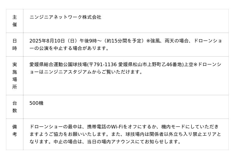 本ドローンショーは、愛媛FCを応援する本試合のマッチスポンサーであるニンジニアネットワーク株式会社(四国本社:愛媛県伊予市、代表取締役社長:村上 忠)が主催し、SkyDriveが企画・運航を担当します。