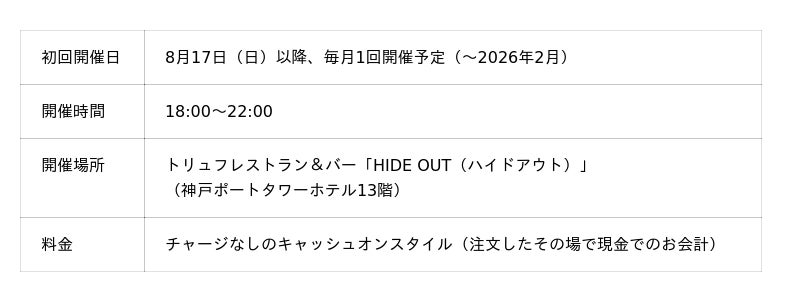 株式会社アベストコーポレーション(代表取締役:松山 みさお)は、地域との協創を掲げた取り組みの一環として、神戸の老舗バーと連携した特別イベント「HIDE OUT SESSION KOBE BAR PORT CRUISE」を、「神戸ポートタワーホテル」(支配人:薩摩利幸、所在地:兵庫県神戸市中央区)最上階13階のレストラン「HIDE OUT(ハイドアウト)」にて、2025年8月より毎月第3日曜日に開催いたします。