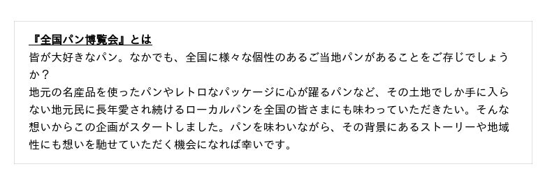 『全国パン博覧会』は、北海道から九州・沖縄まで全国の人気のご当地パンが集結するイベントです。地元の名産品を使ったパンやレトロなパッケージに心が躍るパンなど、その土地でしか手に入らない地元民に長年愛され続けるローカルパンが一堂に会します。