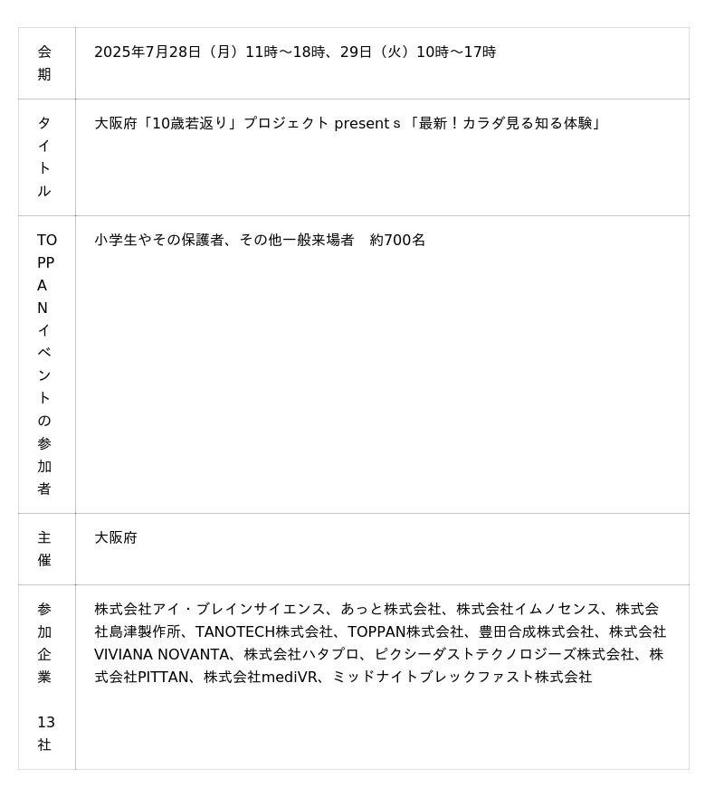 TOPPAN株式会社(本社:東京都文京区、代表取締役社長:大矢 諭、以下 TOPPAN)は、2025年7月28日(月)から29日(火)に大阪・関西万博で開催された大阪府「10歳若返り」プロジェクト presents「最新!カラダ見る知る体験」においてVRを使った吹き矢体験イベントを実施しました。大阪府が大阪・関西万博に向けて進めてきた本プロジェクトの取組みを広く発信し、府民の健康づくりや活動的な生活に向けた行動変容を目的に開催した本イベントにおいて、TOPPANブースでは、昨年大阪府の介護施設で身体能力の向上効果を検証した吹き矢のVRコンテンツを約700名が体験しました。