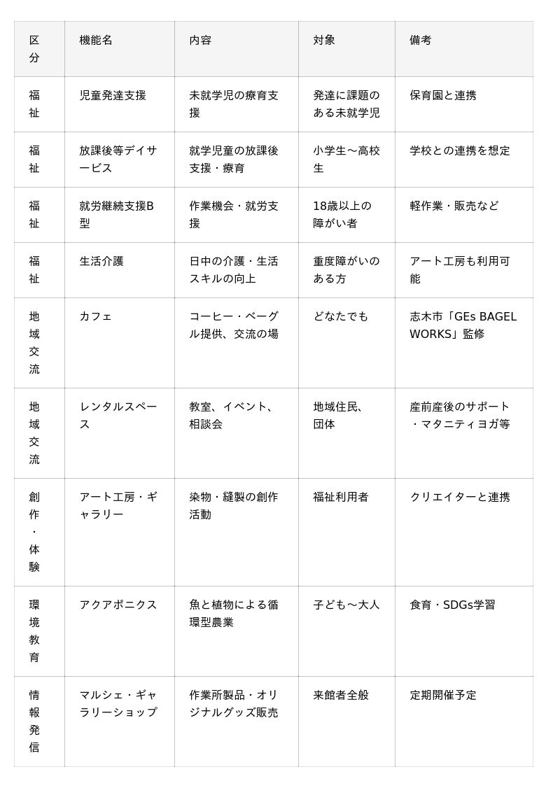 サービス内容(予定):就労支援・生活介護支援・児童発達支援・放課後等デイサービスなどの福祉施設。カフェ、アート工房及びギャラリー、レンタルスペース、マルシェや展示会などのイベント開催営業日:月曜日~土曜日(日祝・年末年始 除く)営業時間(予定):10時00分~18時00分