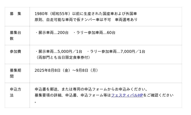 募集するのは1980年(昭和55年)以前に生産された車両で、会場内に展示する「展示部門」200台と会場を基点に桐生近郊を走行する「ラリー部門」60台です(※「ラリー部門」はスピードを競うものではありません)。