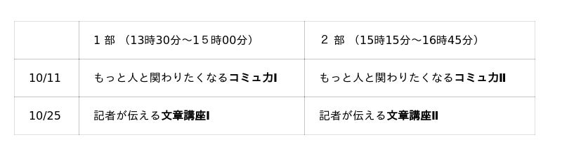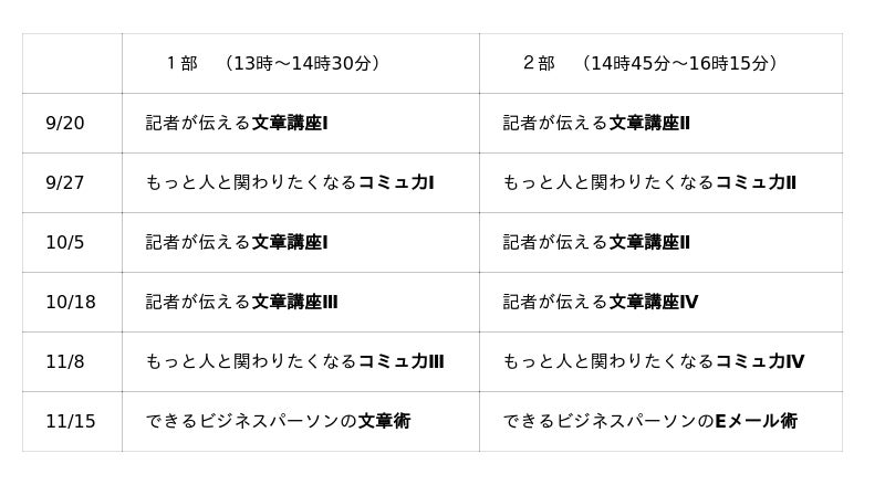 単発での受講も可能ですが、文章講座I・II、III・IV(III・IVはセット券のみ)コミュ力I・II、III・IVはセットでの受講をお勧めしています!