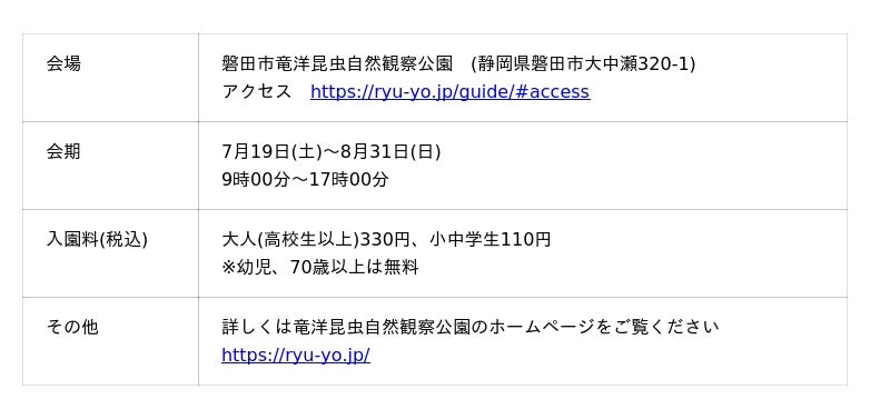 磐田市(静岡)にある竜洋昆虫自然観察公園では、8月31日(土)まで「世界のカブト・クワガタ展」を開催中です。毎年子どもたちが夏休みを迎えるこの時期に実施している大人気イベントで、大人も楽しめる内容になっています。