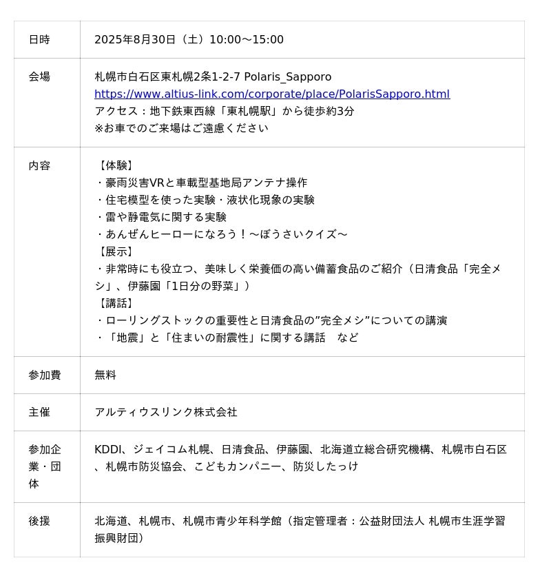 アルティウスリンク株式会社(所在地:東京都渋谷区、代表取締役社長:若槻 肇、以下 アルティウスリンク)は、札幌市白石区にあるBPO・コンタクトセンター拠点「Polaris_Sapporo(R)」において、地震・災害が起きた時に役立つ知識を楽しみながら身につけられる防災イベント「災害対策フェスタ」を8月30日(土)に開催いたします。