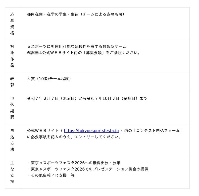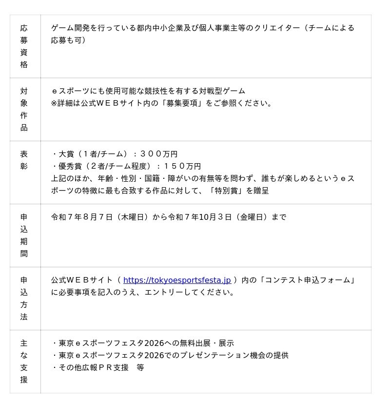 また、7回目を迎える今回は、新たな企画として「Tokyo esports Game Development Contest」を実施します。これは都内中小企業やインディーゲームクリエイター、学生等を対象とした対戦型ゲーム開発コンテストで、受賞者はフェスタでのブース出展やプレゼンテーションを通じて、国内外に向けて広く受賞作品をPRすることが出来ます。