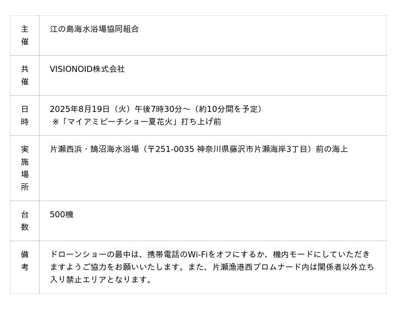 本ドローンショーは、江の島海水浴場協同組合とVISIONOID株式会社(東京都港区、代表取締役:竹中悠満)が連携し、江の島に語り継がれる「天女と龍神」の神話をテーマに、夜空に壮大なストーリーを演出し、SkyDriveが運航を担当します。