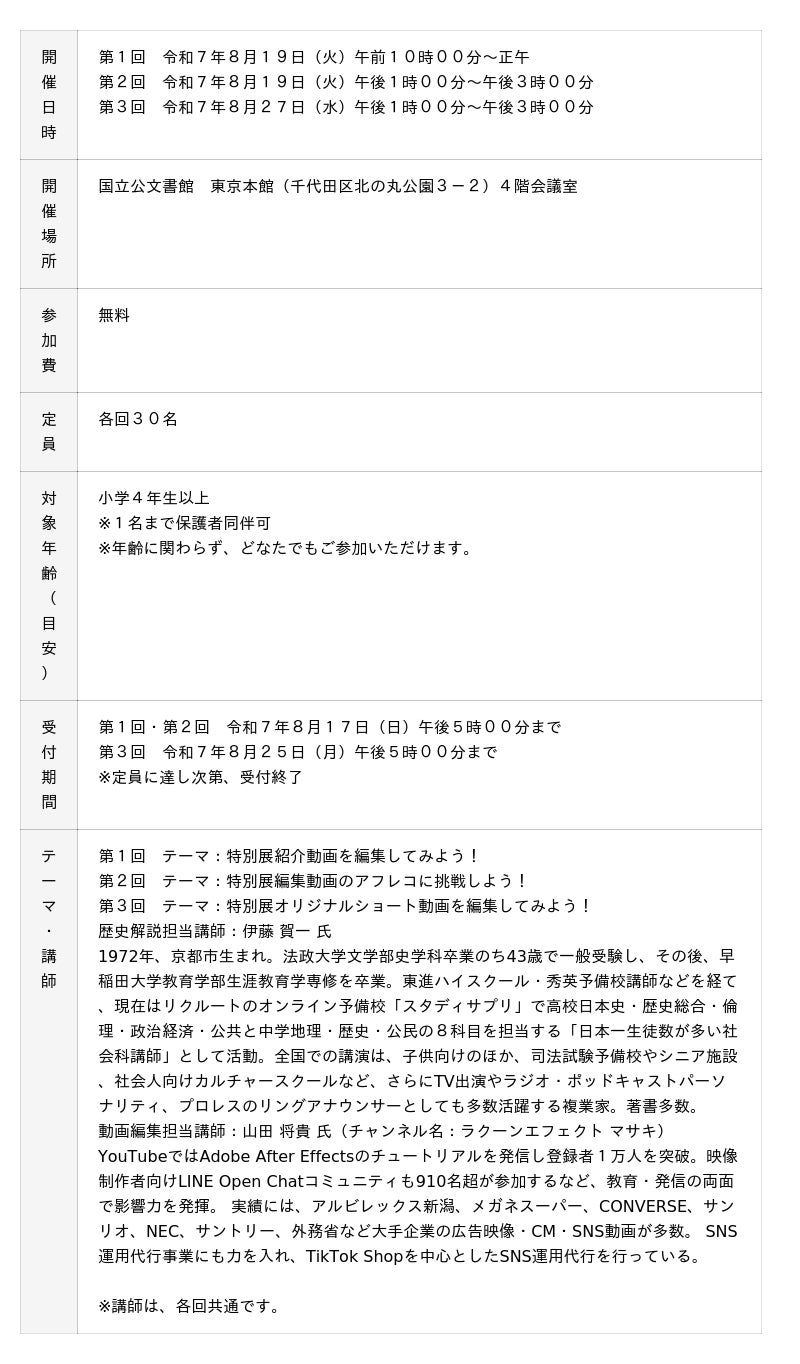 特別展のテーマである「終戦」について、プロの社会科講師の解説を受けた後、動画編集のプロの指導のもと、2人1組のチームで特別展に関連した動画制作に挑戦できるワークショップを開催いたします。