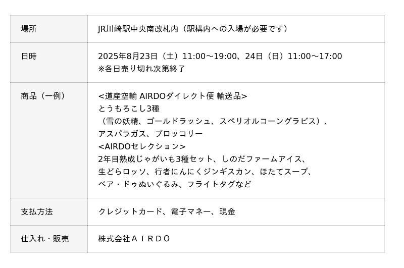 また、道産野菜に加えて、北海道スイーツやジンギスカン、AIRDOの機内ドリンクサービスで大好評の「ほたてスープ」やAIRDOオリジナルグッズをラインナップ。お子さまから大人まで存分に北海道を味わえる2日間となっております。