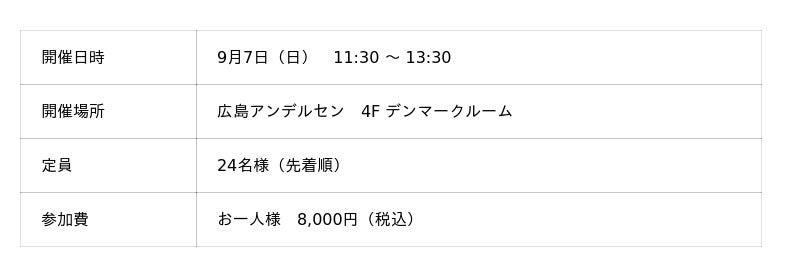 広島アンデルセン代表電話 082-247-2403(受付時間 10:00~19:00)講師プロフィール くらもとさちこさん広島県出身・コペンハーゲン在住。デンマークで培われた豊かな文化を独自の視点で紹介し、企画立案や執筆を中心に活動中。専門は食と食文化。著書に『北欧デンマークのライ麦パン ロブロの教科書』(誠文堂新光社)
