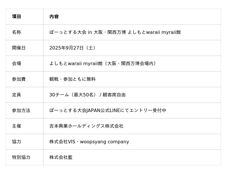 株式会社VIS(代表取締役CEO 古井敬人)は、韓国企業のwoops yang company(ぼーっとする大会の企画会社)と共同で2025年4月~10月に開催される大阪・関西万博のパビリオン「よしもと waraii myraii館」において、90分間ただ“ぼーっと”過ごすだけで心身を整える国際ウェルネス競技『ぼーっとする大会』を開催します。本大会は2014年韓国発祥、世界6カ国で愛されてきた“spaceout competition”の日本版で、著名芸人の実況が入り、オーディエンス投票と心拍数チェックによる技術採点を組み合わせたユニークさが特徴です。情報過多時代におけるストレスと注意力枯渇という社会課題に対し、「笑い×余白」の体験価値を提示し、来場者のウェルビーイング向上と万博テーマ“いのち輝く未来社会のデザイン”へ貢献します。