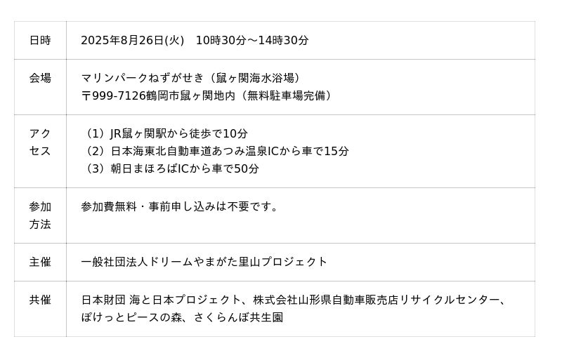 一般社団法人 ドリームやまがた里山プロジェクトは、2025年8月26日(火)に「ユニバーサルビーチinマリンパークねずがせき」を開催いたします。障がい者も健常者も一緒に楽しむことができるイベントです。このイベントは、次世代へ豊かで美しい海を引き継ぐために、海を介して人と人とがつながる“日本財団「海と日本プロジェクト」”の一環です。