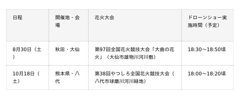 ※3…当初予定していた静岡「第72回安倍川花火大会」(花火大会の中止に伴い、大空大合唱も中止)、北海道「第59回おたる潮まつり大花火大会」、熊本「第38回やつしろ全国花火競技大会」の3会場に加え、秋田「第97回全国花火競技大会『大曲の花火』」での開催が新たに決定しました。