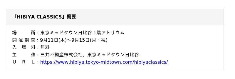三井不動産株式会社(本社:東京都中央区、代表取締役社長:植田 俊、以下「三井不動産」)、東京ミッドタウン日比谷(千代田区有楽町 事業者:三井不動産株式会社)は、9月11日(木)~15日(月・祝)までの5日間、クラシック音楽やオペラを身近に楽しむイベント「HIBIYA CLASSICS」を開催いたします。