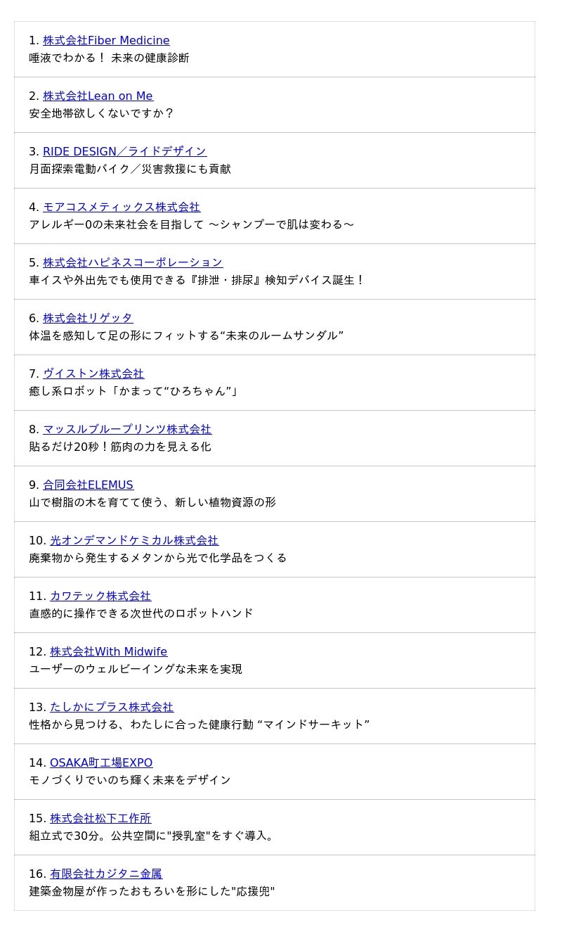 唾液でわかる未来の健康診断や、災害救援にも貢献できる月面探索電動バイク、30分で完成する組立式授乳室など、全16社の製品・技術が一堂に会します。