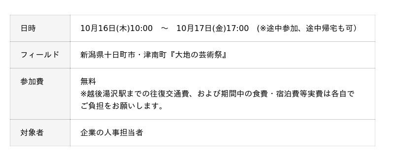 10月16日(木)・17日(金)に新潟県十日町市・津南町(越後妻有エリア)にて、多企業人事担当者と交流できる現場体感型人事イベント『越境学習モニターツアー』を開催します。本イベントの運営は株式会社Ridiloverが務めます。