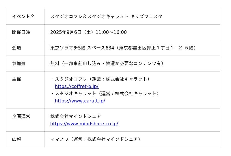 株式会社キャラット(本社:奈良県香芝市)が提供する子育て世帯に人気のフォトスタジオ「スタジオコフレ」と「スタジオキャラット」が主催の親子向け無料イベント「スタジオコフレ&スタジオキャラット キッズフェスタ」が、2025年9月6日(土)に東京ソラマチにて開催されます。