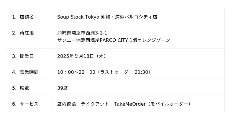 株式会社サンエー(本社:沖縄県宜野湾市、代表取締役社長:豊田沢)は、2025年9月18日、株式会社スープストックトーキョー(本社:東京都目黒区、取締役社長 :工藤萌)とのフランチャイズ契約に基づき、「Soup Stock Tokyo 沖縄・浦添パルコシティ店」を出店いたします。