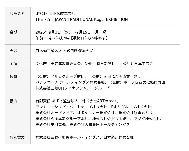 三越は、1904年(明治37年)に日本で初めて百貨店として開業して以来、芸術・文化振興に取り組んでまいりました。その一環として、1954年(昭和29年)に日本工芸会の主催による「第1回 無形文化財日本伝統工芸展」を開催。以来「日本伝統工芸展」として毎年開催し、本年で第72回を迎えます。