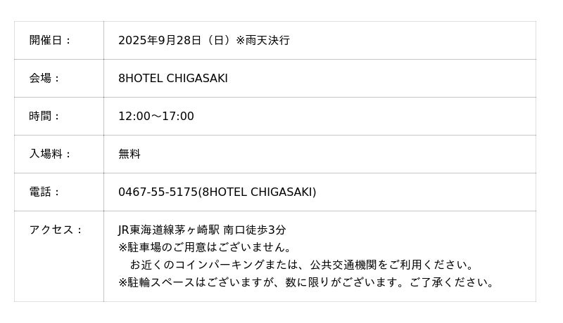 8HOTEL CHIGASAKIのコンセプト、“FEEL OCEAN,FEEL LOCAL,FEEL YOURSELF”に基づいた、マルシェイベントの第3回が2025年9月28日(日)に開催されます。