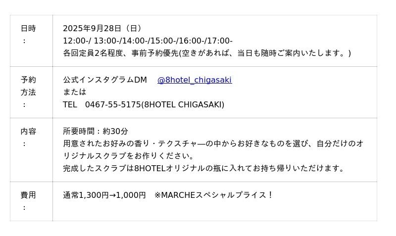 また、前回大好評だった8HOTEL CHIGASAKI「手作りスクラブ」のワークショップも開催!アロマの香りが広がるオリジナルのスクラブ作りをマルシェ特別価格でお楽しみいただけます。