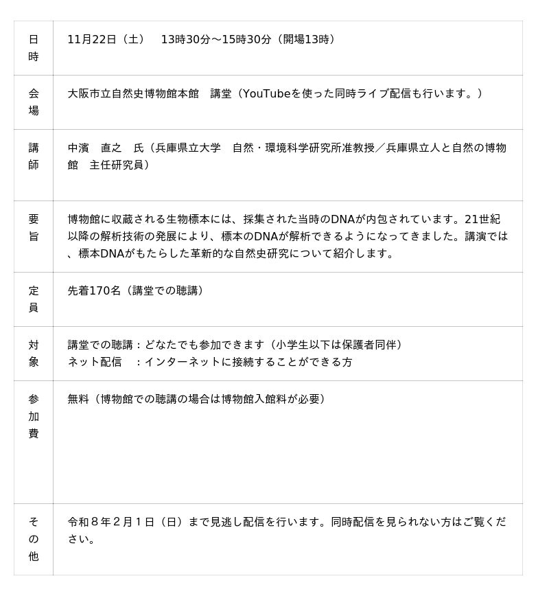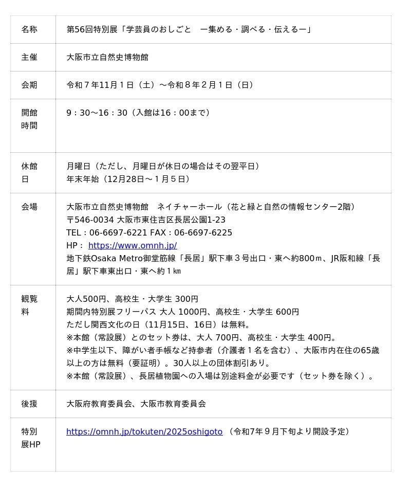 ■ジュニア自由研究・標本ギャラリー小・中学生、高校生の自由研究の成果を紹介する「ジュニア自由研究・標本ギャラリー」を、自然史博物館ネイチャーホールにおいて特別展「学芸員のおしごと ー集める・調べる・伝えるー」と同時開催します。自然史博物館では、小・中学生、高校生の自由研究の方法や標本作りの個別相談に対応し、応援しています。その成果である小・中学生、高校生の作った生き物や岩石・化石の標本、および生物・地学分野の自由研究を募集し、展示します。応募した観察ノートやポスターなどの自由研究の成果や標本には、それぞれ学芸員からのコメントも添えて展示します。