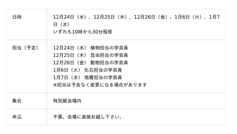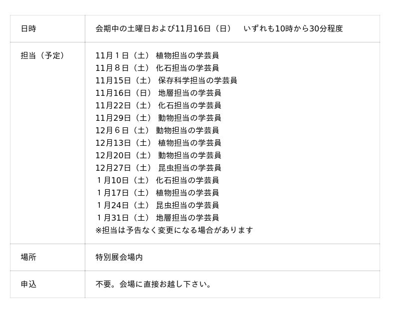 特別展で一番やさしい子ども向け行事。ハカセやスタッフといっしょに展示を楽しみましょう。