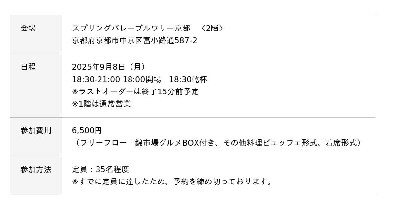 さらに、京都錦市場商店街振興組合・専務理事の宇津さんによる錦市場のご紹介トークや、SVB京都創業時からのSVBファンの一人でもあるシンガーソングライター・梶有紀子さんのライブステージも開催。心温まる歌声とともに、京の恵みを堪能する秋の一夜をお過ごしいただけます。