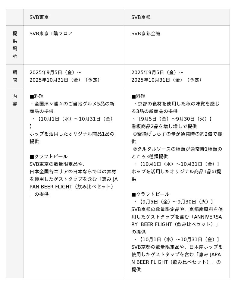 SVB東京は、全国津々浦々のご当地グルメ、そしてSVB京都は、開店8周年を記念して地元である京都の食材を使用した秋の恵みをふんだんに感じられる料理と、秋の味覚に合わせて醸造した限定ビールなどが楽しめる秋限定のフェア