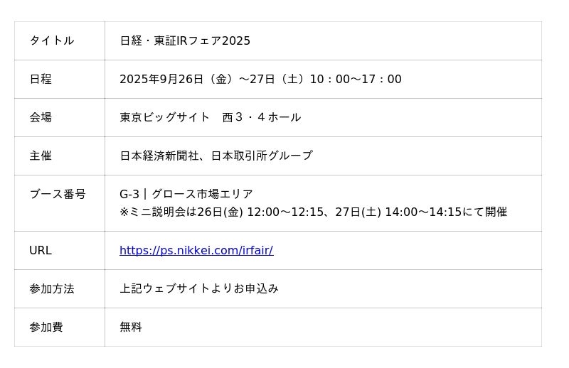個人投資家の皆様にとって、当社のビジョンや将来性を直接ご理解いただける貴重な機会となりますので、ぜひお気軽にご参加ください。皆様のご来場を心よりお待ちしております。