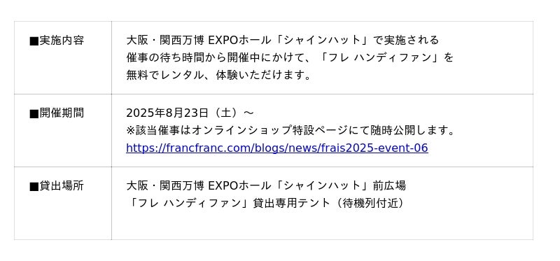 例年以上の猛暑が続く今夏、Francfrancは「フレ ハンディファン」シリーズを通じて全国のみなさまに涼しさをお届けしてきました。今回は、屋内での長時間の滞在や多くの来場者が見込まれる万博会場においても快適にお過ごしいただけるよう、万博内のEXPOホール「シャインハット」での無料貸し出しを実施します。ハンディファンのデザインや機能性もチェックしながら、催事の待ち時間や観覧を涼しく快適にお楽しみください。
