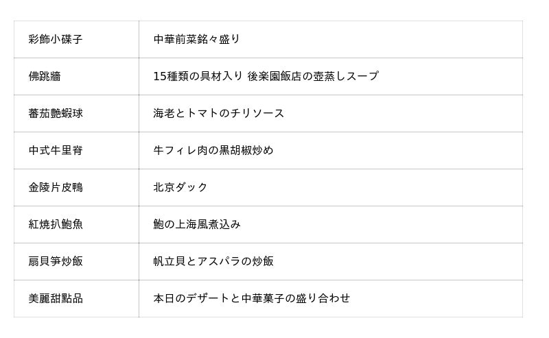 リニューアルを記念し、歴代の中国皇帝に愛された伝統料理として知られている「15種類の具材入り 後楽園飯店の壺蒸しスープ」(佛跳牆・ぶっちょうしょう)を目玉メニューとした、鮑の上海風煮込みや北京ダック、海老とトマトのチリソースや牛フィレ肉の黒胡椒炒めなど豪華ラインナップから成る「鳳凰コース」をご用意いたします。