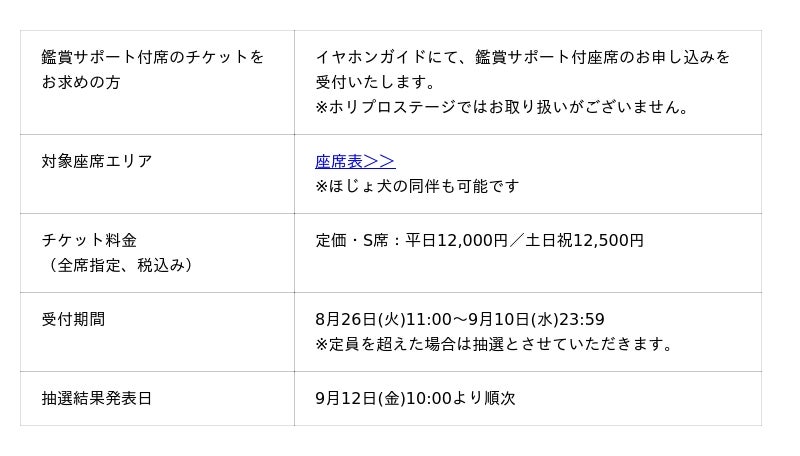上記以外の回にご来場の、きこえない・きこえにくいお客様への台本貸し出しサポートを予定しております。お申し込み受付は、ホリプロステージにて、公演一週間前を目処にフォームによる受付を予定しております。