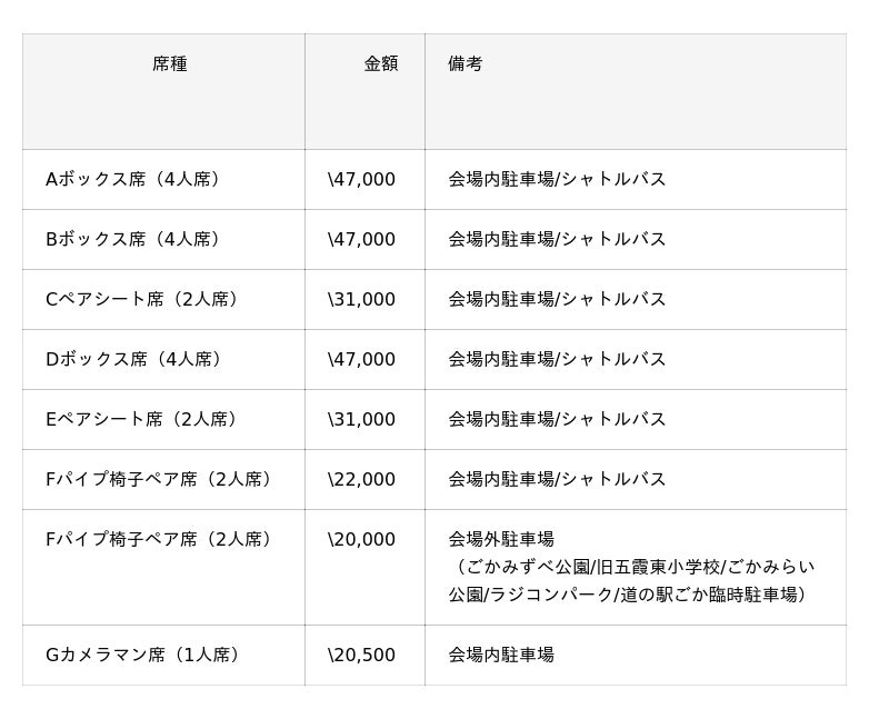 - 駐車場またはシャトルバス付観覧席は「完全チケット制」になります。- チケットを購入していない方は入場できないため、ご注意ください。