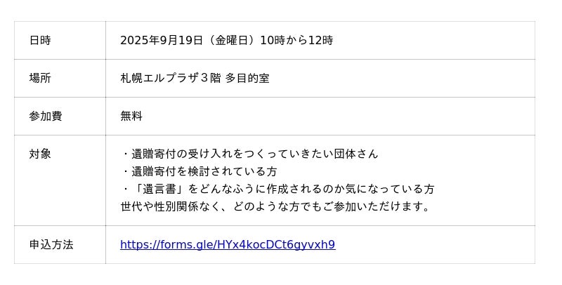 【9月10日から19日】遺贈寄付ウィーク2025の連携企画を札幌で開催。遺言書作成ワークショップや、弁護士による遺言相談を実施します。