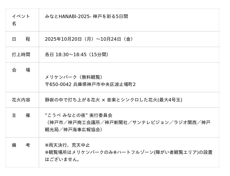 今年は、神戸の海に映える「澄碧(ちょうへき)の青」と六甲の山々がまとう「常盤(ときわ)の緑」を基調とした自然の色彩が織りなす静寂な花火から一転、秋が深める恋愛や感謝といった“愛のカタチ”テーマに音楽とシンクロした花火を打ち上げます。