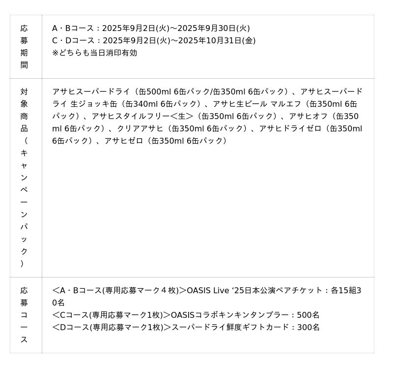 アサヒビール株式会社(本社 東京、社長 松山一雄)は、イギリスのロックバンド「OASIS」の日本公演チケットなどが当たる「OASIS Live ’25 日本公演チケットが当たる!キャンペーン」を9月2日から実施します。9月2日から発売する対象のキャンペーンパックを購入して応募すると「OASIS」の日本公演ペアチケットが各日15組30名に、OASISコラボキンキンタンブラーが500名に、「スーパードライ鮮度ギフトカード」が300名に当たります。公式サイトでの一般販売は終了する中、今回の日本公演チケットが当たるキャンペーンを通じて、「スーパードライ」の購入喚起を図ります。