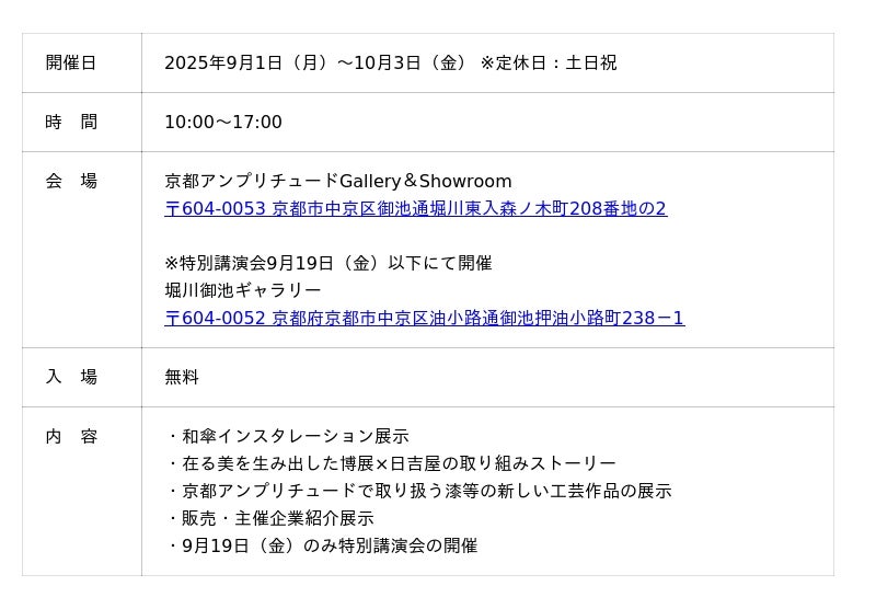 2025年9月1日(月)~10月3日(金)の1ヶ月にわたり、株式会社日吉屋と株式会社博展、京都アンプリチュード株式会社が共同で「伝統工芸×デザイン×テクノロジー」-工芸アートによる空間提案の可能性-を開催いたします。