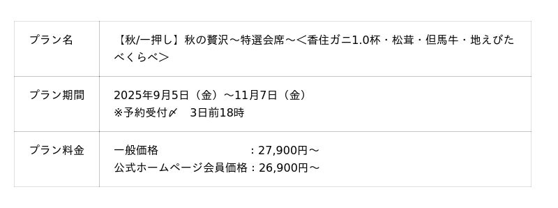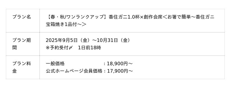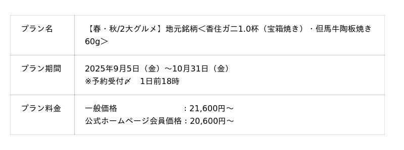 秋のスタンダード会席をベースにしつつも、【秋の味覚/香住ガ二1.0杯(宝箱焼き)】を味わえる期間限定のランクアッププランです。