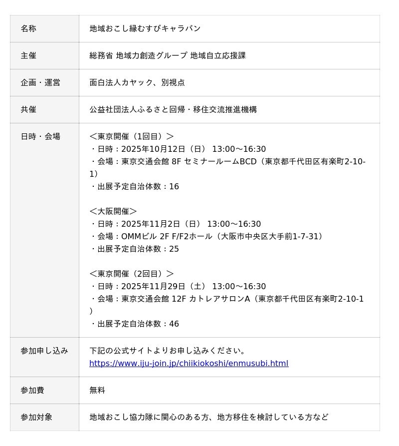 ★「地域おこし縁むすびキャラバン」に参加をご希望の方は、下記の公式サイトよりお申し込みください(参加無料)。