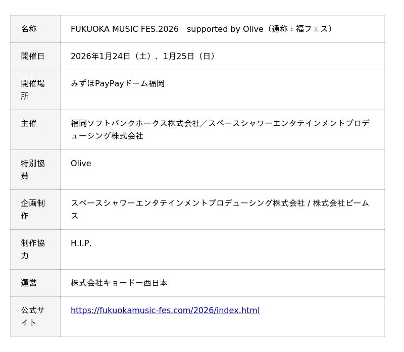 福岡ソフトバンクホークス株式会社と、スペースシャワーエンタテインメントプロデューシング株式会社(本社:東京都港区、代表取締役社長:案納俊昭)およびセレクトショップ「BEAMS」を展開する株式会社ビームス(本社:東京都渋谷区、代表取締役社長:設楽洋)と共同でプロデュースする音楽フェス「FUKUOKA MUSIC FES.2026 supported by Olive(以下、福フェス)」を2026年1月24日(土)・25日(日)の2日間、みずほPayPayドーム福岡で開催いたします。