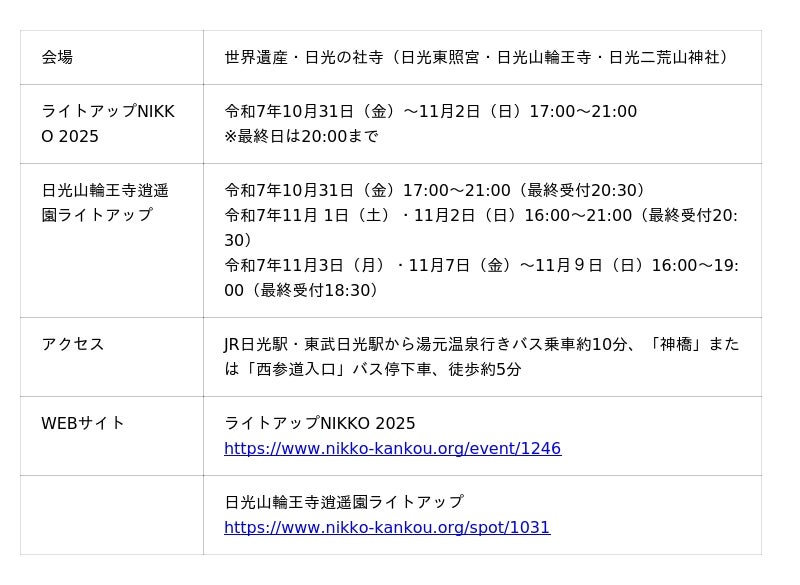世界遺産・日光の社寺が、秋の夜に幻想的な光で彩られる「ライトアップ NIKKO 2025」。日光東照宮や日光山輪王寺、日光二荒山神社を総称する『日光の社寺』がやさしい灯りに包まれ、昼間とは異なる静謐な美しさに出会えます。紅葉に照らされた歴史的建造物の佇まいが、見る人の心に深く静かに響きます。