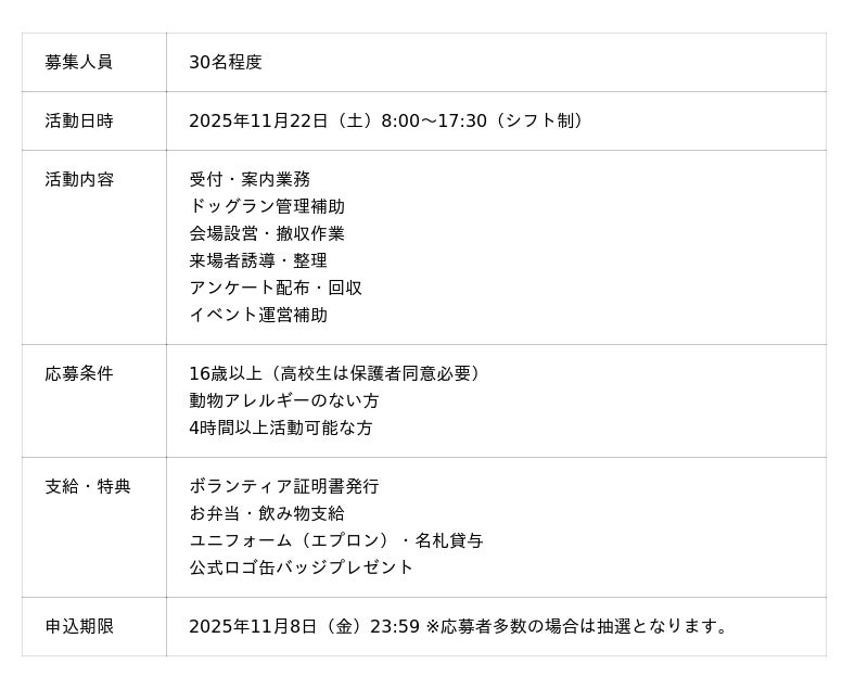 ペット飼育者と未経験者の相互理解を深め、災害にも強い共生社会を目指す複合イベントを初開催します。地域住民や企業・行政と連携し、学び・体験・交流を一度に楽しめる多彩なプログラムを展開。数千人規模の来場を見込む地域発の大規模イベントです。現在、出店者・協賛企業・ボランティアスタッフを広く募集しています。1.【イベント概要】