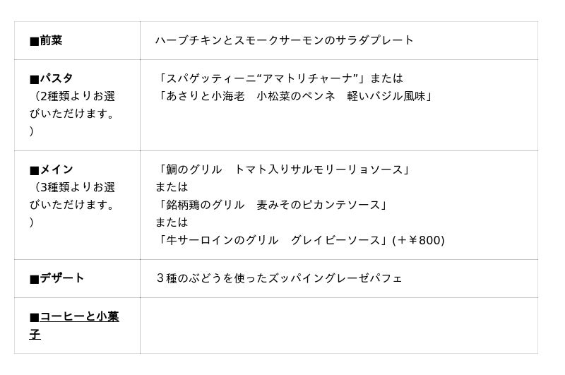 前菜のサラダプレートから始まり、パスタ、メイン料理、季節のパフェがご堪能いただける、乾杯ドリンクが付いた平日限定のランチコースです。パスタは2種類、メインは3種類からお選びいただけるため、その時々の気分によってお好きなものをお召し上がりいただけます。