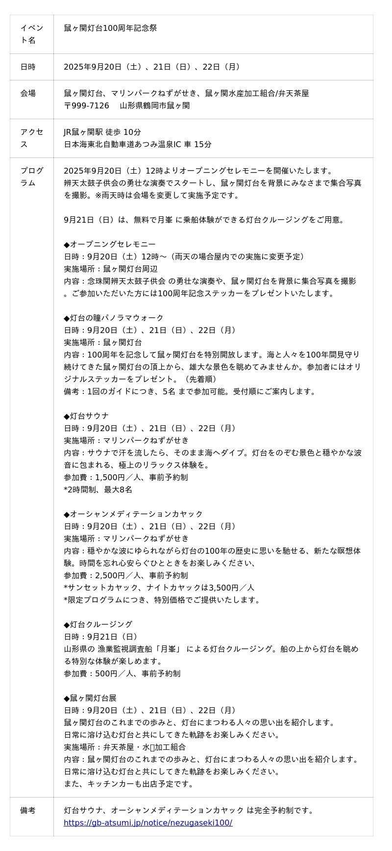 鼠ヶ関灯台利活用推進委員会は、2025年9月20日(土)、21日(日)、22日(月)に鼠ヶ関灯台100周年記念祭を開催いたします。このイベントは、日本財団「海と日本プロジェクト」の一環として、灯台を中心に地域の海の記憶を掘り起こし、地域と地域、異分野と異業種、日本と世界をつなぎ、新たな海洋体験を創造していく「海と灯台プロジェクト」の助成を受けて実施します。